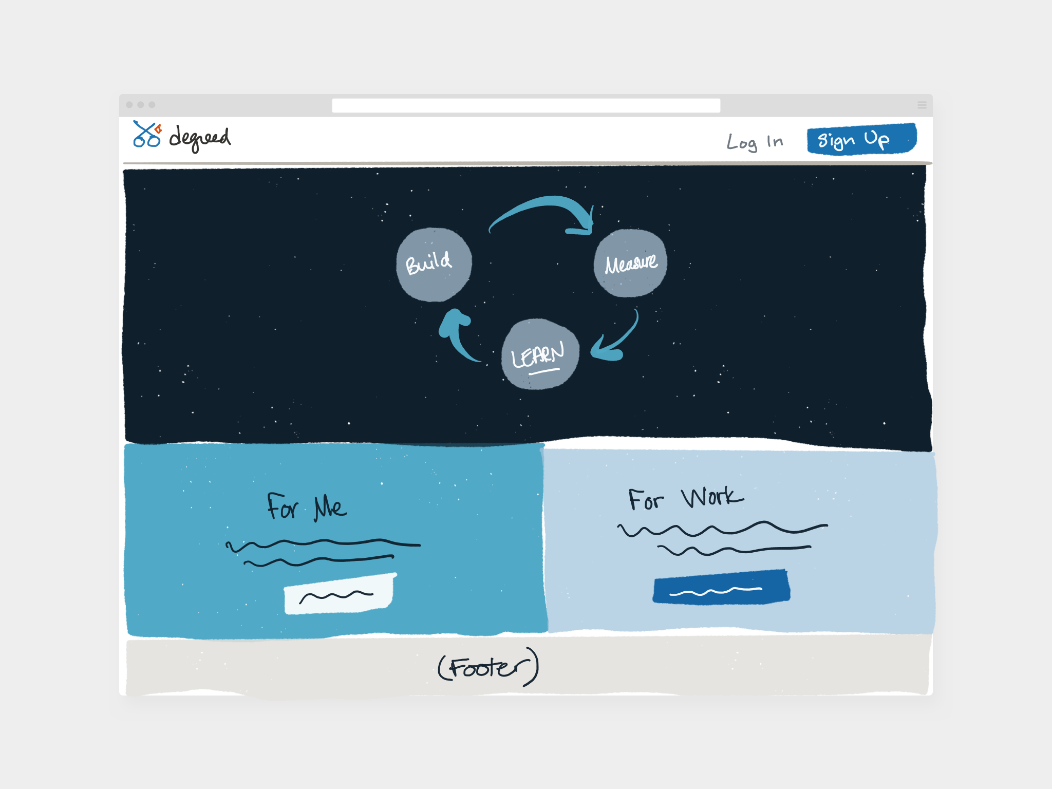 Once the information architecture/site map was determined, I began sketching potential layouts for the Degreed.com homepage, as well as explorations for navigation paradigms. Ideally, I wanted the navigation to closely mirror the patterns already existing in the Degreed platform, so I stayed very close to those visually while exploring ways to seamlessly incorporate calls to action (such as Log In and Sign Up) within the header.